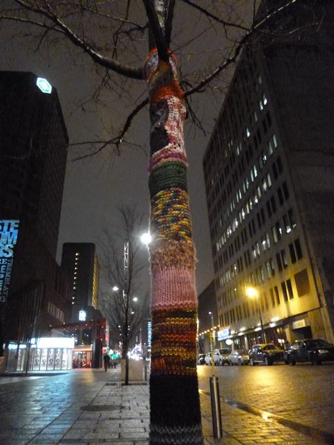 | Le tricot-graffiti collectif tel qu'on pouvait le voir ce soir devant la Maison du développement durable |